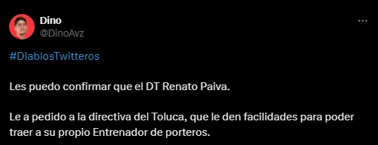El director técnico les solicitó a las autoridades la posibilidad de traer al club a su propio entrenador de porteros, ya que hasta este momento lo ha acompañado César Lozano, a quien ‘heredó’ del ciclo anterior de Carlos María Morales al frente del primer equipo.
