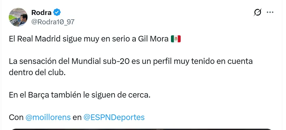 De acuerdo a la información que brindó el periodista Roda en conjunto con Moi Llorens en ESPN Deportes, Real Madrid sigue muy en serio a Gilberto Mora y tienen informes muy positivos del mediocampista mexicano pensando en el futuro.