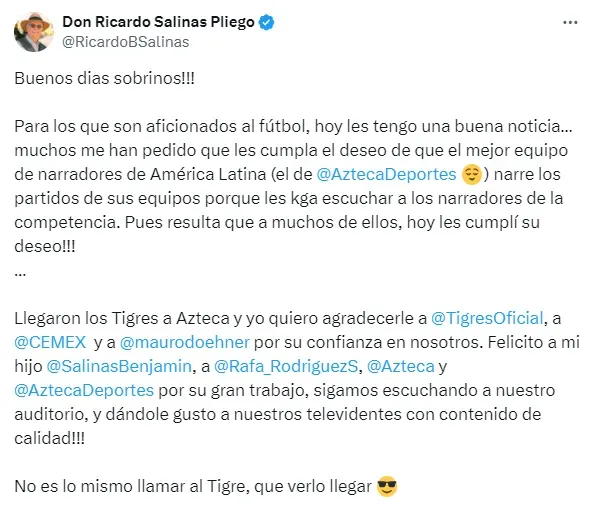 “Para los que son aficionados al fútbol, hoy les tengo una buena noticia… muchos me han pedido que les cumpla el deseo de que el mejor equipo de narradores de América Latina (el de AztecaDeportes) narre los partidos de sus equipos porque les kga escuchar a los narradores de la competencia. Pues resulta que a muchos de ellos hoy les cumplí su deseo!!!”, escribió en un principio Ricardo Salinas en su cuenta de X (ex Twitter).