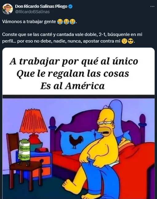 “A trabajar porque al único que le regalan las cosas es al América”, dice el meme de Salinas. Sin embargo, esta publicación no debe sorprender, ya que Ricardo suele mantener un estilo provocador en las redes sociales, aunque también muy sarcástico.