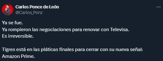 Mientras el equipo de Robert Siboldi lucha por entrar en la Fase Final del certamen doméstico, la directiva ya ha hecho sus movimientos. Tal es así que en las últimas horas salió a la luz que los Felinos ya le anunciaron a Televisa que no renovarán su contrato. Pero, además, Tigres estaría muy cerca de firmar contrato con Amazon.