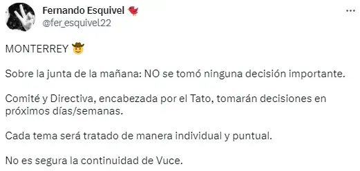 De acuerdo a información del periodista Fernando Esquivel, en la mañana ocurrió una junta en el CF Monterrey en la que no se tomó ninguna decisión. Sin embargo, con Tato Noriega a la cabeza, en los próximos días se tratarán los casos importantes de manera individual, y la continuidad de Víctor Vucetich al frente del equipo “no es segura”.