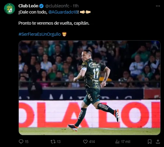 Tras el anuncio del resultado que arrojaron los estudios, el club le dio todo su apoyo al futbolista, que recibió como un baldazo de agua fría el tener que ausentarse en los desafíos venideros. “Dale con todo, Andrés; pronto te veremos de vuelta, Capitán”, expresó León a través de sus redes sociales.