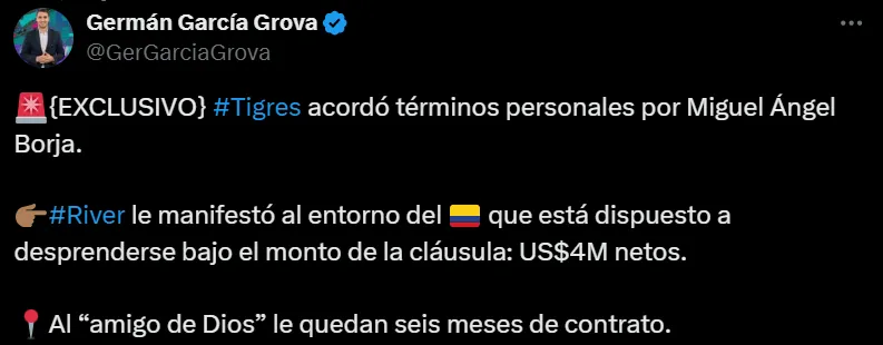 Se trata de Miguel Borja. El ‘9’ colombiano se encuentra disputando el Mundial de Clubes 2025 con el Millonario y todo apunta a que será titular en lo que resta de la fase de grupos por la lesión de Sebastián Driussi. Al margen de esto, Germán García Grova confirmó que Borja y Tigres ya tienen un acuerdo contractual.