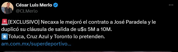 Según reveló el periodista César Luis Merlo en Súper Deportivo, Toluca lleva la delantera por el fichaje de Paradela. Los Diablos Rojos ha sido el más decidido en las gestiones y, por ahora, pica en punta para quedarse con el mediocampista de 25 años.