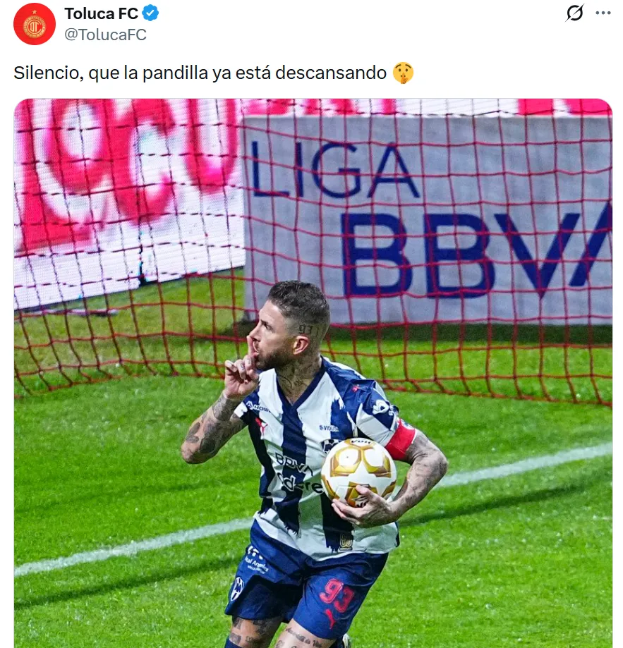 El posteo de Toluca decía: “Silencio, que la pandilla ya está descansando”, acompañado de una imagen de Sergio Ramos. El detalle picante fue que el español había mandado a callar a la afición escarlata tras marcar su gol de penal minutos antes, por lo que el mensaje del club se tomó como una respuesta directa y cargada de ironía.