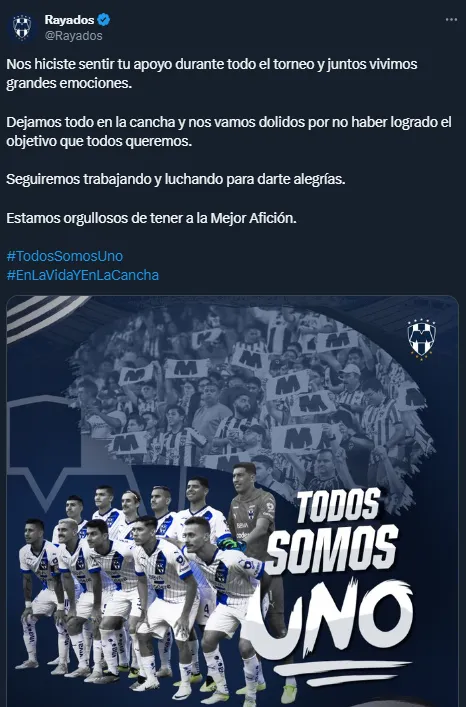 Luego de la eliminación, Rayados hizo una publicación agradeciéndole a la afición por el apoyo. “Nos hiciste sentir tu apoyo durante todo el torneo y juntos vivimos grandes emociones. Dejamos todo en la cancha y nos vamos dolidos por no haber logrado el objetivo que todos queremos. Seguiremos trabajando y luchando para darte alegrías. Estamos orgullosos de tener a la Mejor Afición”, dice la misma.