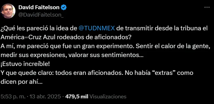 “¿Qué les pareció la idea de TUDN de transmitir desde la tribuna el América-Cruz Azul rodeados de aficionados? A mí, me pareció que fue un gran experimento. Sentir el calor de la gente, medir sus expresiones, valorar sus sentimientos… ¡Estuvo increíble! Y que quede claro: todos eran aficionados. No había “extras” como dicen por ahí…“, escribió en sus redes sociales.