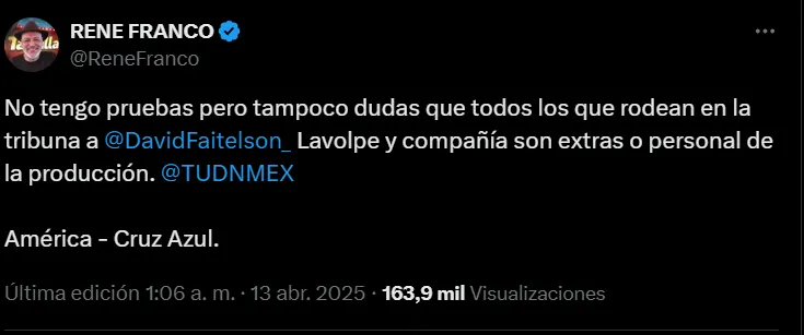 El primero en reventar todo fue René Franco, quien desde sus redes sociales soltó una bomba que no tardó en hacer eco: “No tengo pruebas pero tampoco dudas de que todos los que rodean en la tribuna a David Faitelson, La Volpe y compañía son extras o personal de la producción“, reveló. Su comentario encendió las alarmas y alimentó las sospechas de que la escena transmitida por TUDN no fue tan espontánea como se vendió.