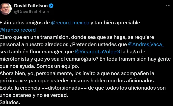 “Estimados amigos de RÉCORD y también apreciable Francotirador, claro que en una transmisión, donde sea que se haga, se requiere personal a nuestro alrededor. ¿Pretenden ustedes que Andrés Vaca sea también floor manager, que Ricardo La Volpe la haga de micrófonista y que yo sea el camarógrafo? En toda transmisión hay gente que nos ayuda. Somos un equipo. Ahora bien, yo, personalmente, los invito a que nos acompañen la próxima vez para que ustedes mismos hablen con los aficionados. Existe la creencia ==distorsionada== de que todos los aficionados son unos patanes y no es verdad. Saludos“, expresó.