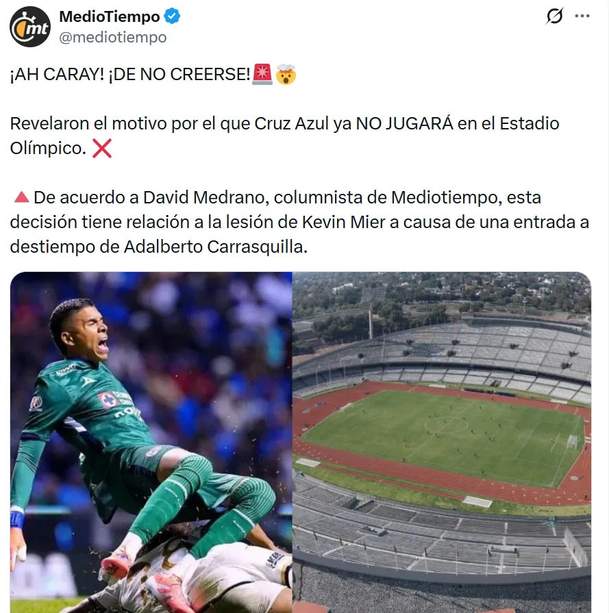 La decisión de la UNAM está vinculada a un incidente ocurrido en partidos recientes: la lesión de Kevin Mier tras una entrada fuerte de Adalberto Carrasquilla encendió tensiones entre los equipos, según informó David Medrano. Ese episodio es uno de los factores que habría complicado la aprobación de la solicitud para jugar en el Olímpico.