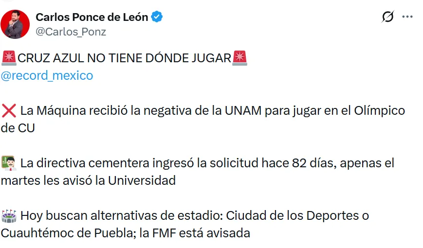 Cruz Azul atraviesa una situación inédita: el club cementero no tiene un estadio confirmado para disputar sus partidos como local en el inicio del torneo. La UNAM negó la solicitud que había presentado la directiva para usar el Estadio Olímpico Universitario, dejando a La Máquina sin una sede definida.