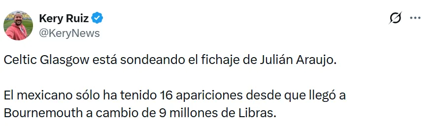 Su poca participación en la Premier League ha generado rumores sobre su futuro. Según Kery Ruiz, Julián Araujo podría continuar su carrera en Escocia, en un club donde tendría la posibilidad de ganarse un lugar como titular y recuperar la continuidad perdida en Inglaterra.