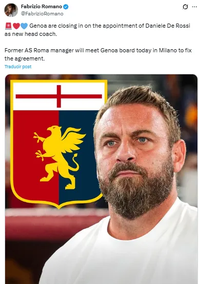 De acuerdo con la información de Fabrizio Romano el día de hoy se reunirá la directiva del conjunto con Daniele de Rossi, el exjugador y estratega de la AS Roma estaría dirigiendo a la escuadra del Genoa con la idea de salvarlos como en su momento hizo con La Loba llevándolos hasta las Semifinales de la Europa League.