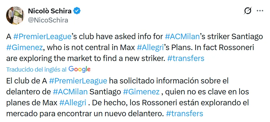De acuerdo a la información del periodista italiano, Nicolò Schira, un equipo de la Premier League preguntó condiciones por Santiago Giménez y el Milan no ve con malos ojos su transferencia. Además, el conjunto italiano está buscando un delantero en el próximo mercado.
