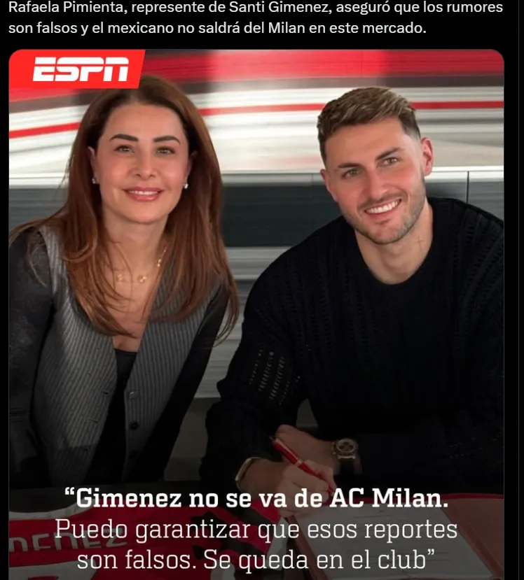 Tras todos los rumores, fue la agente del delantero, Rafaela Pimienta, quien rompió el silencio. La representante confirmó que Giménez continuará en Milán: “Puedo garantizar que los informes sobre una posible salida no son ciertos. Se queda en el club”, despejando cualquier duda sobre su futuro en Italia.