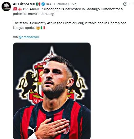 - El equipo Sunderland, recién ascendido a la Premier League, está interesado en fichar a Santiago Giménez.