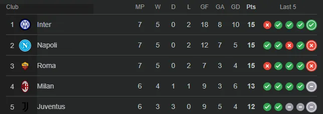 Ante lo visto hoy, en primer lugar quedó Inter con 15 puntos; le sigue Napoli con las mismas unidades y la Roma, también con 15; es ahí donde entran los dirigidos por Massimiliano Allegri quienes tienen 13 puntos hasta el momento y el día de mañana se enfrentarán a la Fiorentina, equipo que en seis partidos disputados sólo suma 3 unidades.