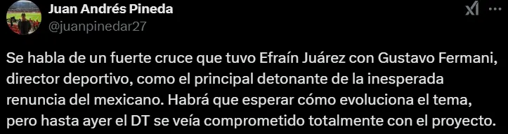 Por otro lado, Juan Andrés Pineda reveló que el ex Selección Mexicana habría mantenido un fuerte cruce con Gustavo Fermani, director deportivo de Atlético Nacional. Al respecto, el mencionado Pipe Sierra agregó que esta discusión estuvo relacionada al mercado de fichajes tras la llegada jugadores que el DT no habría pedido. Sorpresivamente, uno de ellos sería nada menos que Mateus Uribe, ex futbolista del América que jugó en las Águilas entre 2017 y 2019.