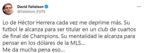 “Lo de Héctor Herrera cada vez me deprime más.Su futbol le alcanza para ser titular en un club de cuartos de final de Champions. Su mentalidad le alcanza para pensar en los dólares de la MLS… Me da mucha pena eso…”, había escrito el siempre polémico periodista de ESPN en relación al fichaje de HH con Houston Dynamo para la próxima temporada.