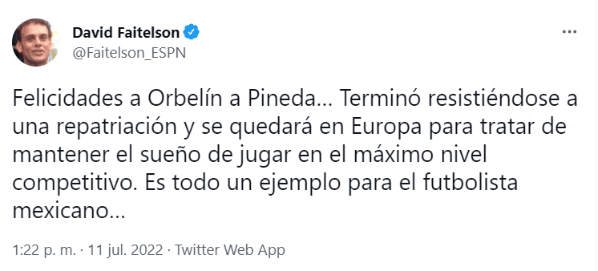 “Felicidades a Orbelín a Pineda… Terminó resistiéndose a una repatriación y se quedará en Europa para tratar de mantener el sueño de jugar en el máximo nivel competitivo. Es todo un ejemplo para el futbolista mexicano”, escribió en su cuenta de Twitter el periodista de ESPN.
