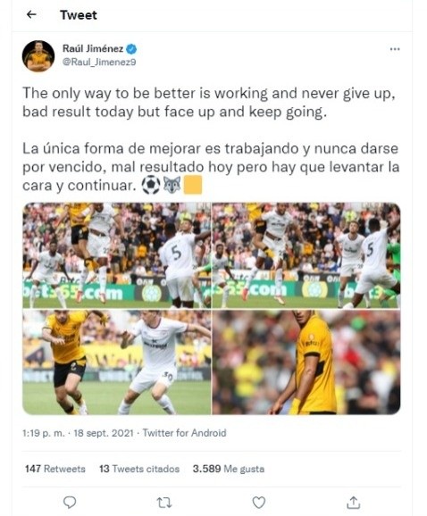 © Twitter Raúl JiménezEl mexicano no se deja vencer pese a los descalabros