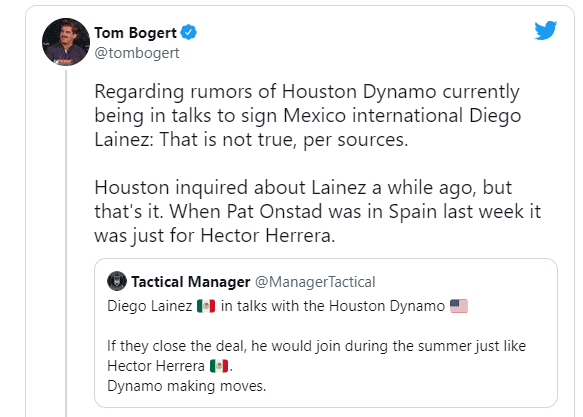 Tanto se habló de este posible arribo que desde la MLS salieron a aclarar la cuestión. El periodista Tom Bogert, que trabaja para la competición, se expresó al respecto en su cuenta de Twitter.“Con respecto a los rumores de que Houston Dynamo está actualmente en conversaciones para fichar al internacional mexicano Diego Lainez: eso no es cierto, según fuentes. Houston preguntó por Lainez hace algún tiempo, pero eso es todo. Cuando Pat Onstad estuvo en España la semana pasada fue solo para ver a Héctor Herrera”, escribió.
