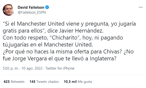 Esas declaraciones no cayeron bien al periodista David Faitleson, quien utilizó su cuenta de Twitter para arrojarle una cruda verdad a la cara. “‘Si el Manchester United viene y pregunta, yo jugaría gratis para ellos’, dice Javier Hernández.Con todo respeto, Chicharito, hoy, ni pagando tú jugarías en el Manchester United”, escribió.