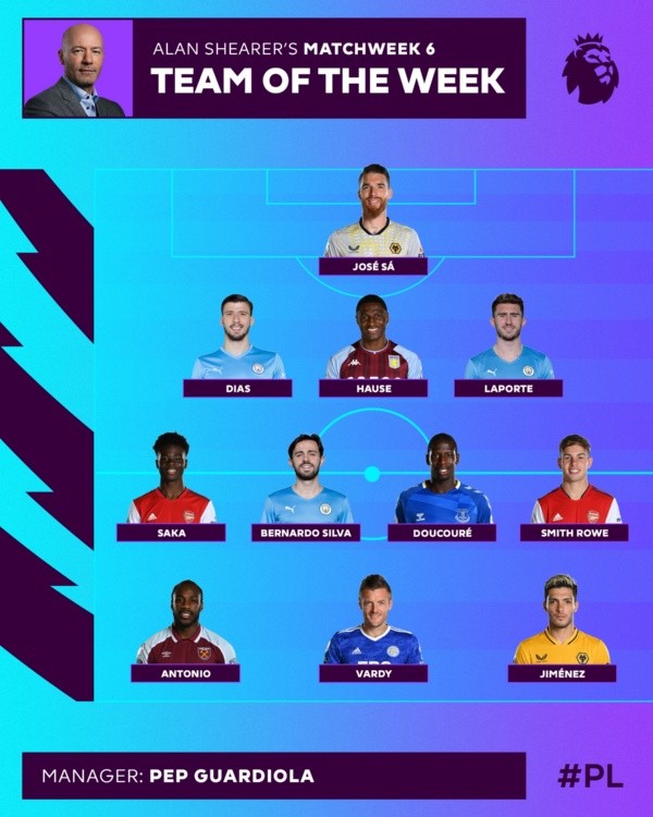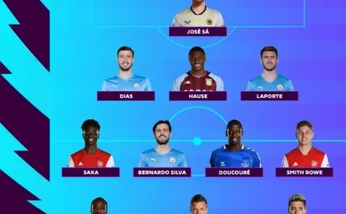 El elencocompleto del máximo anotador de la Premier League es el siguiente: José Sa (Wolverhampton); Rúben Dias (Manchester City), Kortney Hause (Aston Villa), Aymeric Laporte (Manchester City); Bukayo Saka (Arsenal), Bernardo Silva (Manchester City),Abdoulaye Doucouré (Everton), Smith Rowe (Arsenal);Michail Antonio (West Ham), Jamie Vardy (Leicester), Raúl Jiménez (Wolverhampton). Pep Guardiola (Manchester City) es el entrenador.