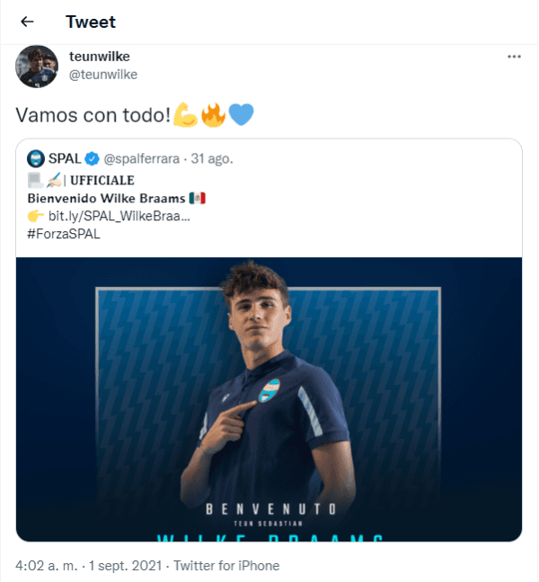 Teun Wilke se convirtió en uno más de la legión mexicana de futbolistas en el extranjero. Así, firmó con SPAL, de la Serie B de Italia, y quedó a un paso de jugar en una competición de élite con algunos de los mejores jugadores del mundo. A pocas semanas de su llegada, puso a Javier Hernández como su máxima inspiración.