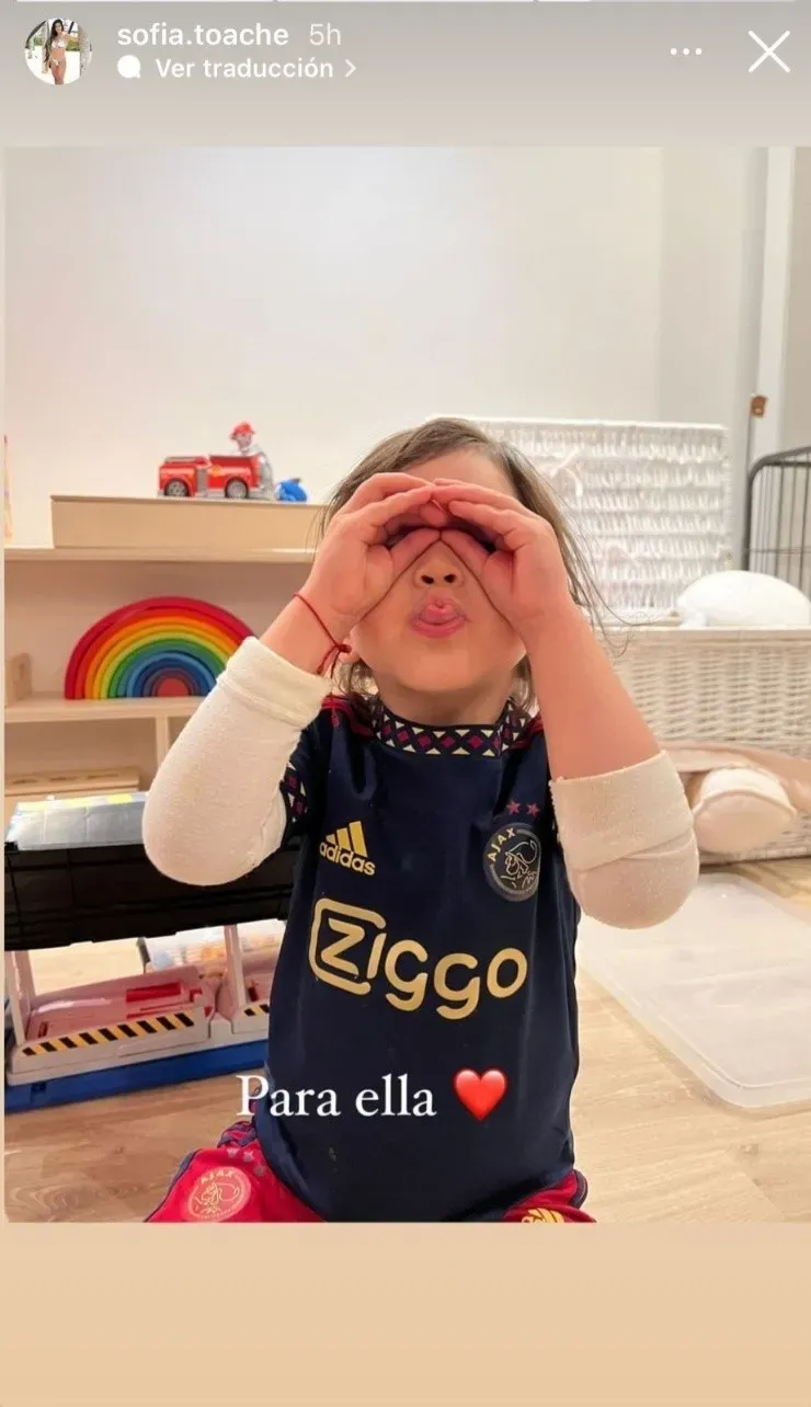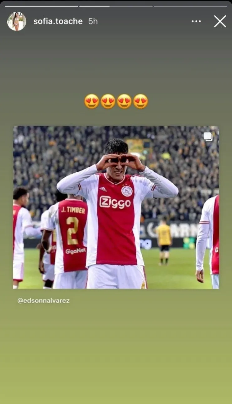 Y es que el gesto de Edson va dedicado a su hija Valentina. Sofía Toaché, pareja del futbolista mexicano, publicó unas historias en su cuenta de Instagram donde muestra a la pequeña imitando el festejo del gol de su padre, que mantiene al Ajax en carrera por el título.
