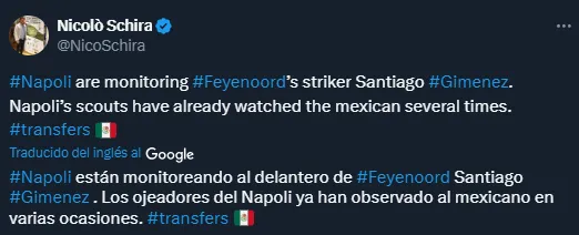 De acuerdo a la información de Nicolò Schira, reconocido periodista italiano especializado en fichajes, Napoli está siguiendo muy de cerca la situación de Giménez. Sin ir más lejos, este mismo viernes afirmó que el conjunto napolitano ya ha estado observando al delantero en reiteradas ocasiones.
