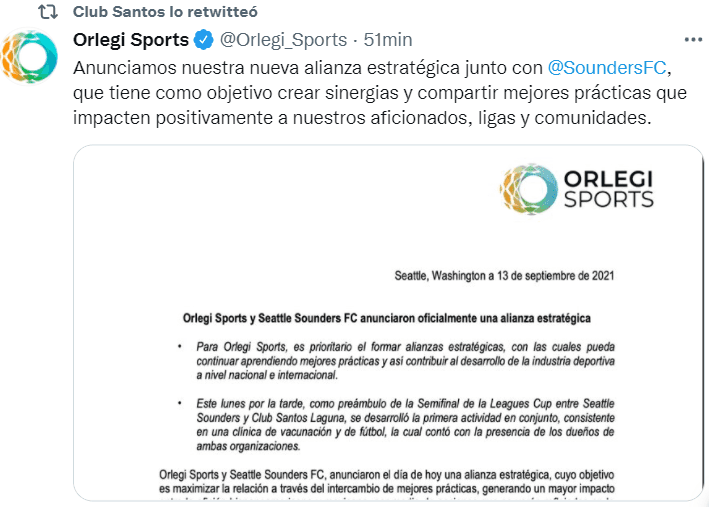 Orlegi Sports y Seattle Sounders FC, anunciaron el día de hoy una alianza estratégica, cuyo objetivo es maximizar la relación a través del intercambio de mejores prácticas, generando un mayor impacto entre la afición hispanoamericana y mexicana, por medio de acciones que se verán reflejadas en la industria deportiva y en sus comunidades.
