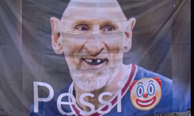 Una de las banderas mostraba a Messi con una caricatura deforme, con orejas grandes, sin dientes, pelado y con la camiseta del PSG. En la misma decía “Pessi”, acompañado de un emoji de payaso, en tono burlón.