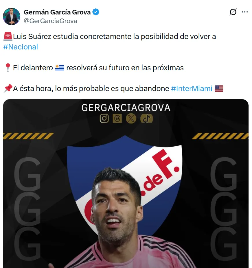 - El periodista Germán García Grova reportó que Luis Suárez podría regresar a Nacional.