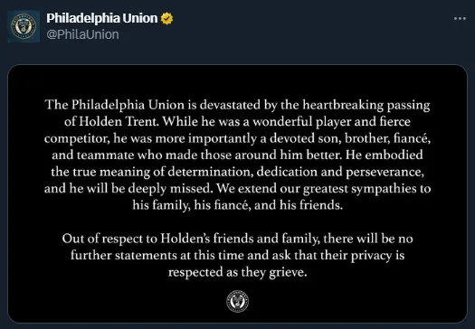 Mediante un comunicado, Philadelphia Union anunció la triste noticia: “Philadelphia Union está devastado por el desgarrador fallecimiento de Holden Trent. Si bien era un jugador maravilloso y un competir feroz, lo más importante es que era un hijo, un hermano, un prometido y un compañero de equipo devoto que mejoró a los que le rodeaban”.
