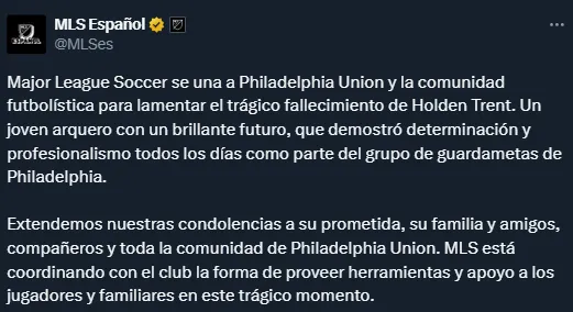 Por su parte, la propia MLS también se expresó al respecto: “Major League Soccer se una a Philadelphia Union y la comunidad futbolística para lamentar el trágico fallecimiento de Holden Trent. Un joven arquero con un brillante futuro, que demostró determinación y profesionalismo todos los días como parte del grupo de guardametas de Philadelphia”.