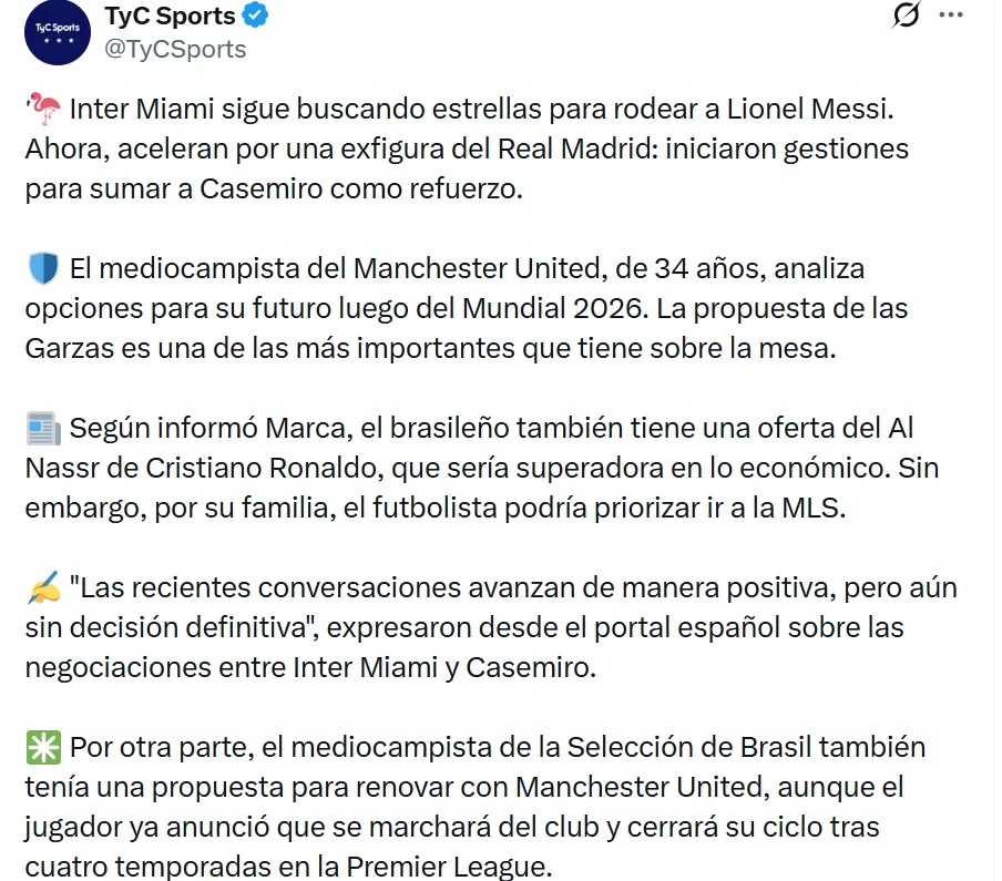 • Inter Miami negocia el fichaje de Casemiro para reforzar el plantel junto a Messi.