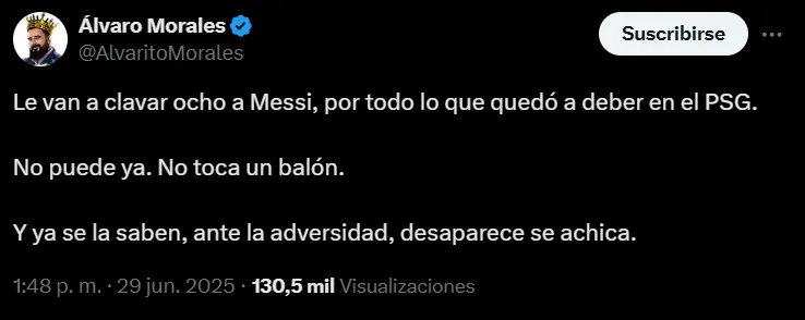 Uno de los que volvió a cargar fuerte fue Álvaro Morales. El periodista, que siempre se muestra crítico con Messi, aprovechó el resultado para disparar sin filtro y soltar dos palabras que encendió la polémica en las redes sociales: “Se achica”.