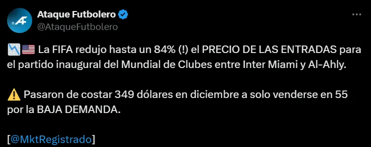 Según reportó el sitio especializado Marketing Registrado, la FIFA tomó una drástica decisión en las últimas horas: reducir hasta en un 84% el precio de los boletos para el partido inaugural que se jugará entre los estadounidenses y los egipcios.