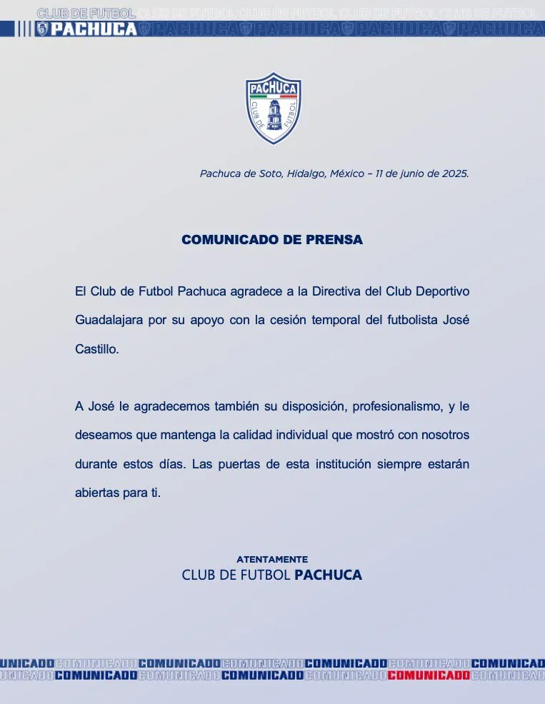 “El Club de Futbol Pachuca agradece a la Directiva del Club Deportivo Guadalajara por su apoyo con la cesión temporal del futbolista José Castillo.