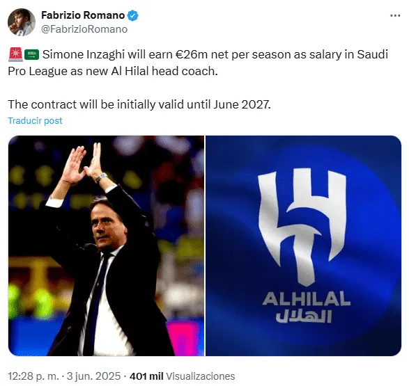 El italiano llegó a un acuerdo con el Al Hilal de Arabia Saudita por los próximos dos años e igualmente dirigirá el Mundial de Clubes ya que el equipo está clasificado a la competición que se jugará este mes y en la cual se enfrentará al Pachuca y Real Madrid.