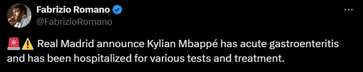 Sin embargo, en las últimas horas la situación se volvió más delicada. Según informó el periodista Fabrizio Romano, Kylian Mbappé fue hospitalizado para realizarse estudios médicos en medio de la competencia. “El Real Madrid anuncia que Kylian Mbappé tiene una gastroenteritis aguda y ha sido hospitalizado para realizar diversas pruebas y tratamientos”, escribió en sus redes.