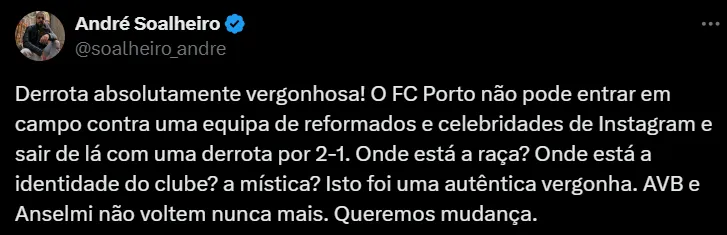 Ante esto, la afición de los Dragones arremetió contra Martin Anselmi, director técnico del equipo, en redes sociales: “¿Dónde está el espíritu? ¿Dónde está la identidad del club? ¿La mística? Fue una verdadera lástima. AVB y Anselmi no deben volver jamás”, “Se acabó. Envía a Anselmi lejos antes de que tengas otra temporada cero“.