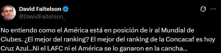 “No entiendo como el América está en posición de ir al Mundial de Clubes. ¿El mejor del ranking? El mejor del ranking de la Concacaf es hoy Cruz Azul…Ni el LAFC ni el América se lo ganaron en la cancha…”, aseguró Faitelson a través de su cuenta personal de X (ex Twitter).