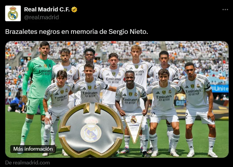 Real Madrid decidió jugar el partido contra Pachuca por el Mundial de Clubes con un brazalete negro en memoria de Sergio Nieto, primer socio del club que falleció en las últimas horas a los 100 años de edad. Entre otros logros, este privilegiado seguidor vivió las 15 Ligas de Campeones que ganó la institución merengue.