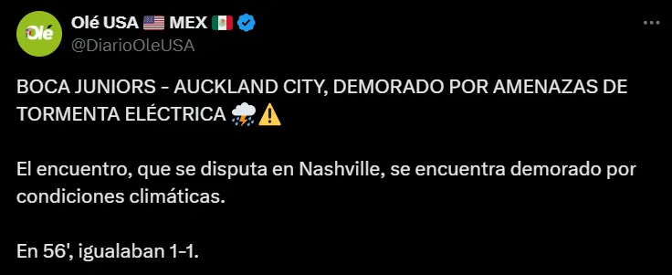 El partido entre Boca Juniors y Auckland City en el Mundial de Clubes 2025 fue suspendido momentáneamente debido a una alerta por tormenta eléctrica en Nashville. La decisión se tomó de inmediato para garantizar la seguridad de jugadores, cuerpo técnico, árbitros y espectadores, ya que los primeros rayos comenzaron a impactar cerca del estadio.
