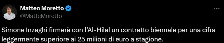 Matteo Moretto, periodista italiano, reveló que Inzaghi percibirá un salario multimillonario tras acordar su llegada a Arabia: “Simone Inzaghi firmará un contrato de dos años con el Al-Hilal por una cifra ligeramente superior a los 25 millones de euros por temporada”.