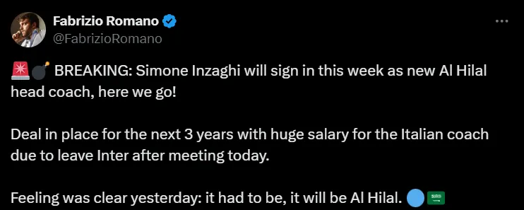 Romano escribió en sus redes sociales: “Simone Inzaghi firmará esta semana como nuevo entrenador del Al Hilal, ¡aquí vamos! Acuerdo vigente para los próximos 3 años con un salario enorme para el entrenador italiano que dejará el Inter después de la reunión de hoy. La sensación ayer era clara: tenía que ser, será Al Hilal”.