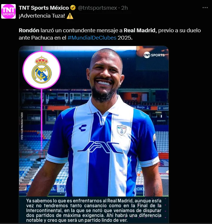 Salomón Rondón, una de las grandes figuras de los Tuzos, le mandó una advertencia al equipo español antes del duelo por la competición internacional. “Este partido contra el Real Madrid será diferente al de la final de la Copa Intercontinental. En aquella ocasión notamos el cansancio, tras ganar a Botafogo en el primer partido y llegar a la tanda de penaltis en el segundo”